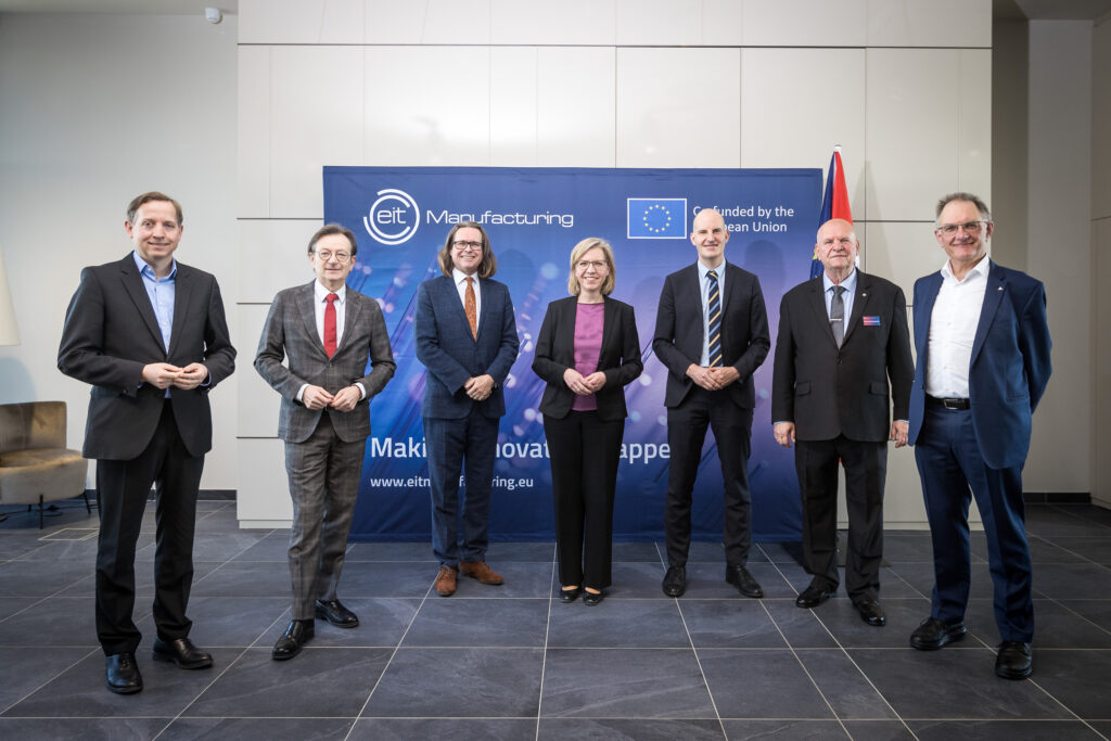 Dipl.-Ing. Michael Esterl (General Secretary & Head of Cabinet BMDW), Mag. Gerhard Hirczi (CEO Vienna Business Agency), Ao. Univ.-Prof. Dr. Martin Polaschek (Federal Minister BMBWF), Leonore Gewessler, BA (Federal Minister BMK), Martin Kern (Director EIT), Johannes Hunschofsky (Director EIT Manufacturing CLC East), Klaus Beetz (CEO EIT Manufacturing); – Photo Credit (c) Matthias Heschl
