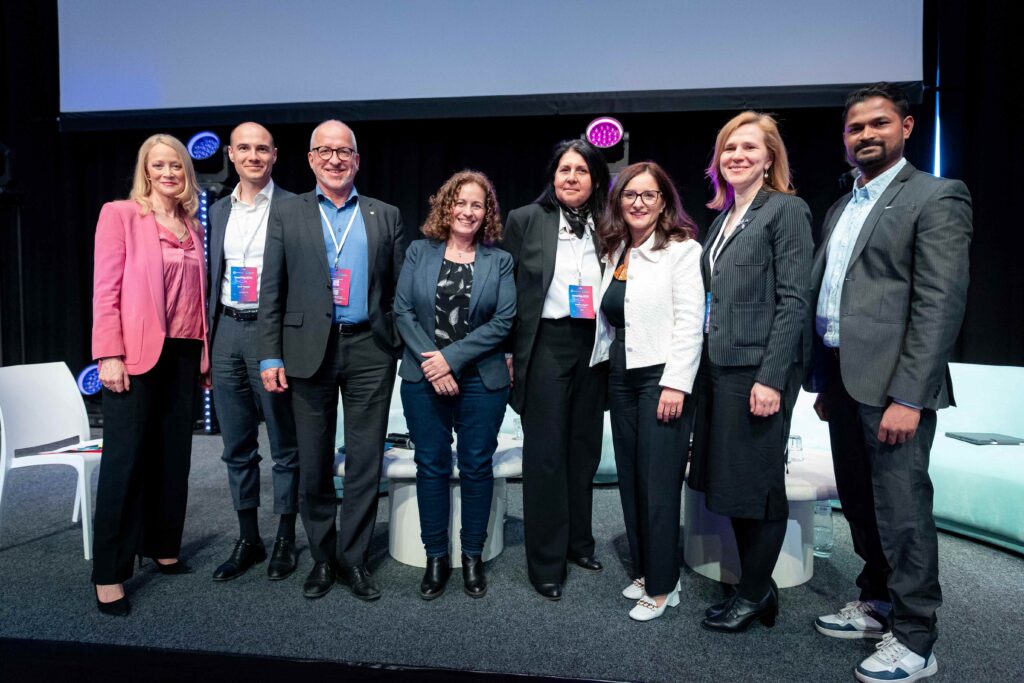 Moderator Karin Helmstaedt, Oscar Pasquali, Johan Stahre, Audrey Stolze, Delphine Rudelli, Diana Filip, Liga Baltina and Kay Nag at InnoHive 2025. Photo credit (c) Xavier Lejeune