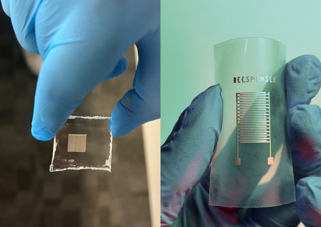 Biosensor arrays and supercapacitor structures fabricated on glass and PET substrates using the Monobee system. Copyright (c) Beespenser