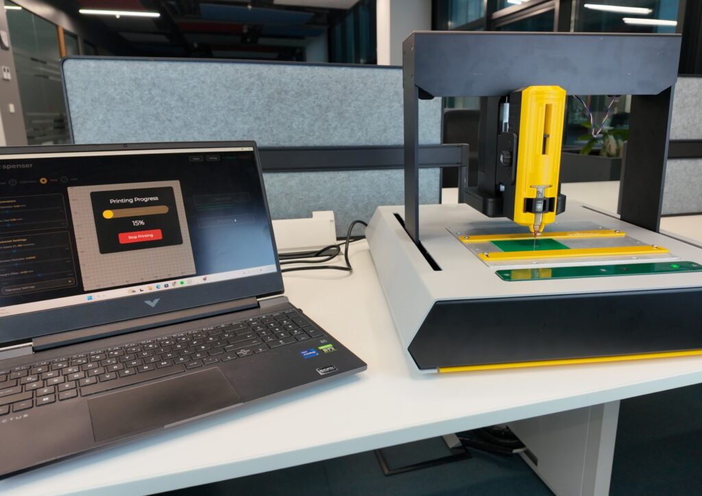 Özdemir explains that in printed electronics, material efficiency can be high, yet this advantage quickly diminishes if functional inks require hazardous solvents, excessive post-processing, or unstable deposition behaviour. A significant part of sustainability lies in how materials are formulated and handled, as well as in how precisely they can be dispensed and controlled during fabrication. Well-defined ink rheology (precisely controlled flow and solidification behaviour of the printing ink) and controlled deposition are essential to minimising waste and ensuring repeatable functional performance.