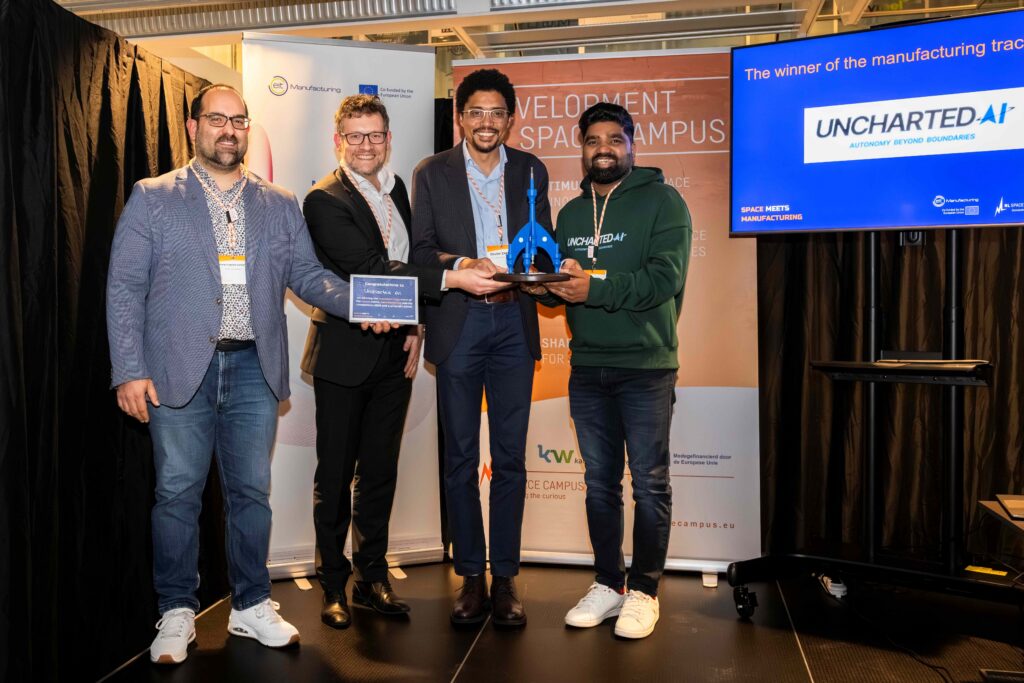 Arnau Castillo Gonzalez (Collins Aerospace), Lari Cujko (ESRIC) and Olivier Zephir (Technoport) together with the winner of the manufacturing track: Pradyumna Vyshnav (Uncharted AI)